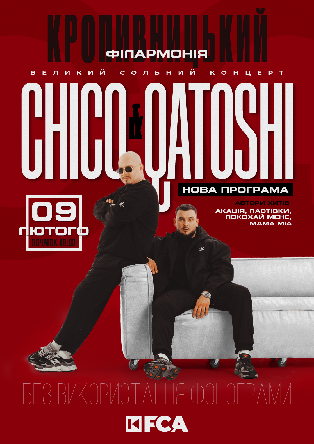 Chico & Qatoshi — автори суперхітів “Ластівки”, “Допоможе ЗСУ”, “Покохай мене” , “Акація” “Mamma mia” та ін. вже 9 лютого в Кропивницькому!