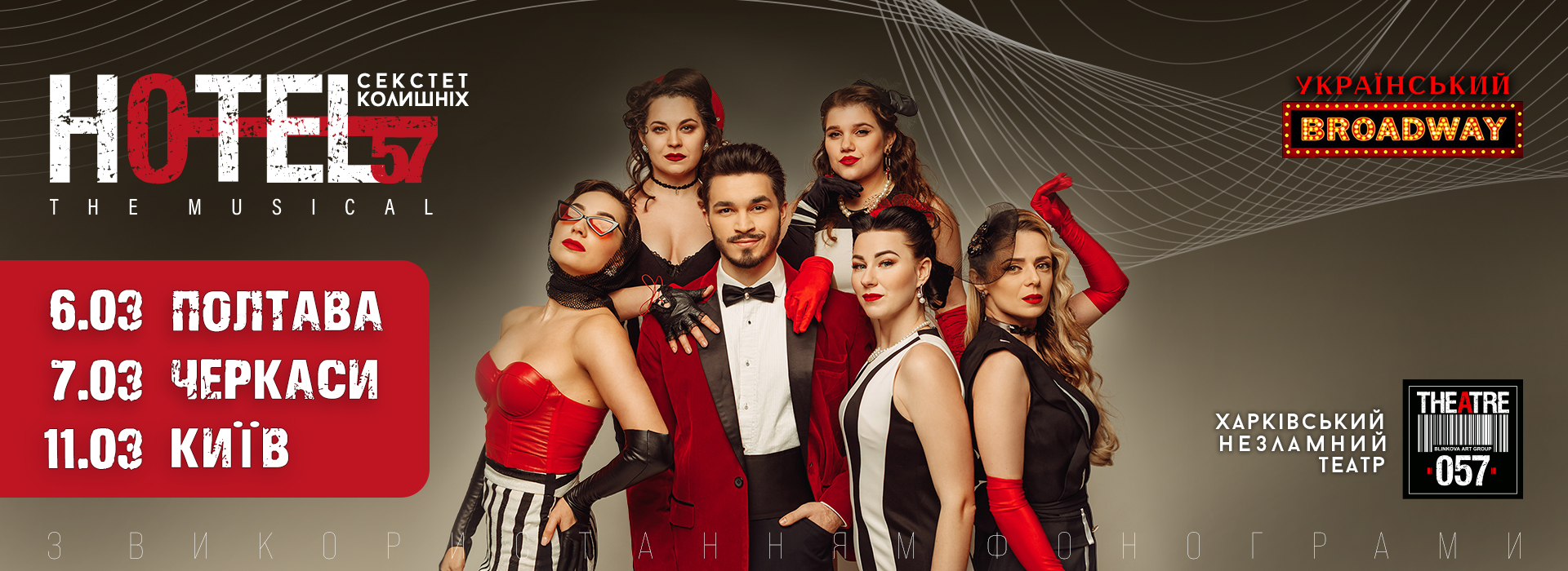 УКРАЇНСЬКИЙ БРОДВЕЙ! Харківський Незалежний музичний Театр «057» представляє Мюзикл «HOTEL“57”: секстет колишніх» ! Запальна комедія в стилі jazz! Усі ми думаємо, що знайшовши свій ідеал, ми назавжди станемо щасливими. Та чи існує він взагалі? Про це ми і дізнаємось на виставі «HOTEL“57”: секстет колишніх» ! Самотній чоловік, який знедавна керує власним готелем, обманом запрошує своїх «Екс» подружок до готелю, задля участі в авторському експерименті. Експеримент полягає у диференціації «не ідеальних» рис колишніх, щоб у майбутньому, не допуститись помилки і не зіштовхнутись з ними знову. На його думку, саме відокремлення вад колишніх допоможе йому знайти ідеальну жінку! Та чи погодяться дівчата на цей експеримент? Дізнаєтесь незабаром. Український мюзикл «HOTEL“57”: секстет колишніх» ! Комедія, яка не залишить байдужим нікого. Нове звучання улюблених світових хітів в джазовій обробці. Не пропусти! Тривалість вистави: 1 година 45 хвилин 16+ Режисерка – Олександра Блінкова Сценаристка – Марина Осіпова Хореографка – Юлія Помазан Вокальний коуч – Анастасія Блінкова Світлорежисер – Олександр Некраха Звукорежисер – Максим Жупник Артур (Керуючий готелем) - Артем Кочергін Колишні керуючого готелем: Пейдж (Гангстерша) – Віолетта Козакова Кейт (Незаймана католичка) - Марина Бедрик Бейла (Бізнес-вумен єврейського походження) - Олександра Блінкова Рубі (Барменка, любителька випити) - Юлія Коровко Скарлетт (Артистка кабаре на антидепресантах) - Світлана Тимченко