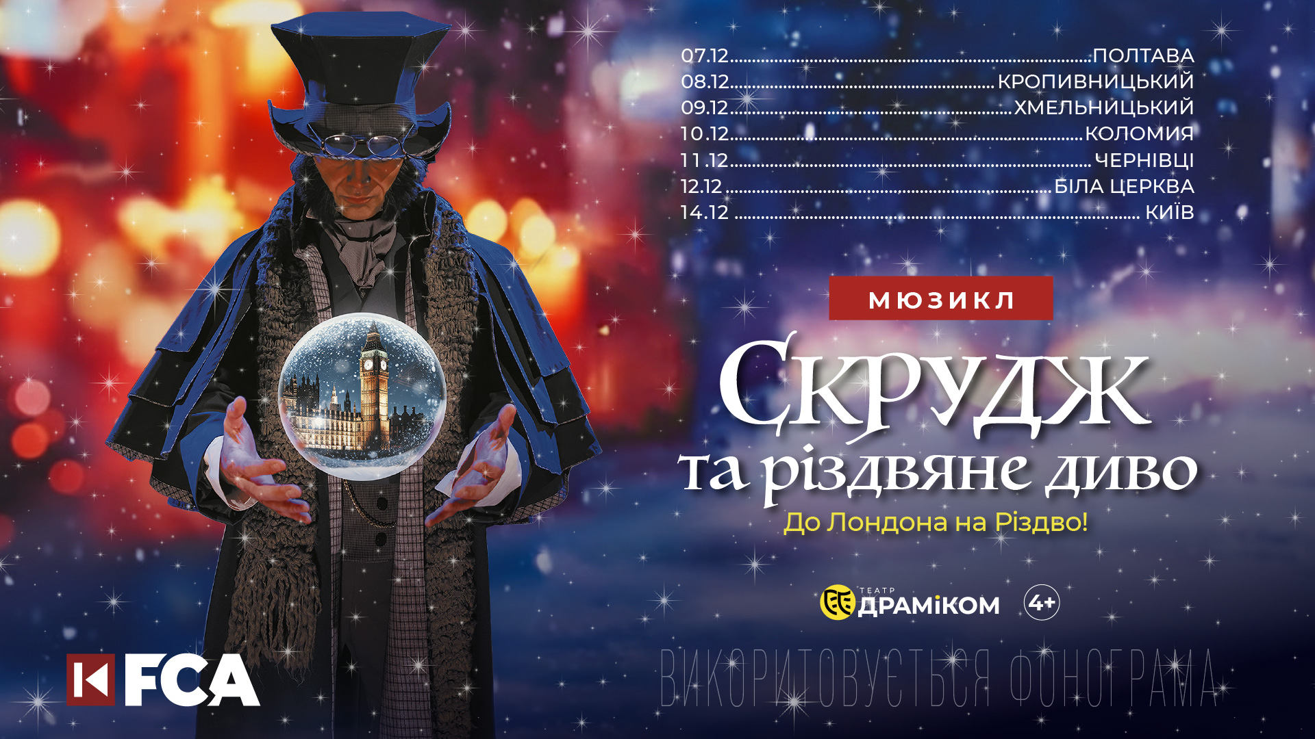 «Скрудж та Різдвяне диво» До Лондона на різдво! Чарльз Дікенс Неймовірна подорож про, яку мріє кожен з нас у Вашому місті. Разом з героями нашого новорічного мюзиклу ми вирушимо до Лондона. Під звуки Біґ-Бену, зробимо стрибок у часі у далеке дев’ятнадцяте століття. Саме так, леді та джентльмени! На вас чекає світ вікторіанської доби: стильні костюми великої епохи, авторська музика, веселі танці, магічне шоу і, звичайно ж, привиди старовинного Лондона. Захоплююча історія жадібного скнари Скруджа, до якого завітають три духи Різдва. Кожен з них підготував своє випробування, яке наш герой долатиме разом з вами. Схоже цей Святвечір стане для всіх по-справжньому особливим і разом ми дізнаємося скільки насправді «коштує» Різдво. Тож, рушаймо разом, леді та джентльмени! Купуйте офіційні квитки на FCA.ua